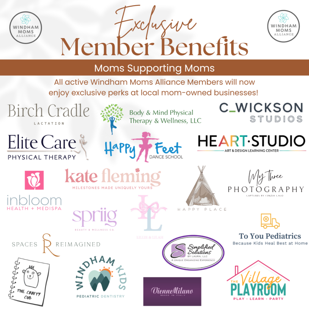 Windham Moms Alliance members also receive discounts at various local mom-owned businesses! See the list of our amazing business partners below! The full discount list can be accessed here: WMA Business Discounts (note the password to access is shared with all active, dues-paying members).